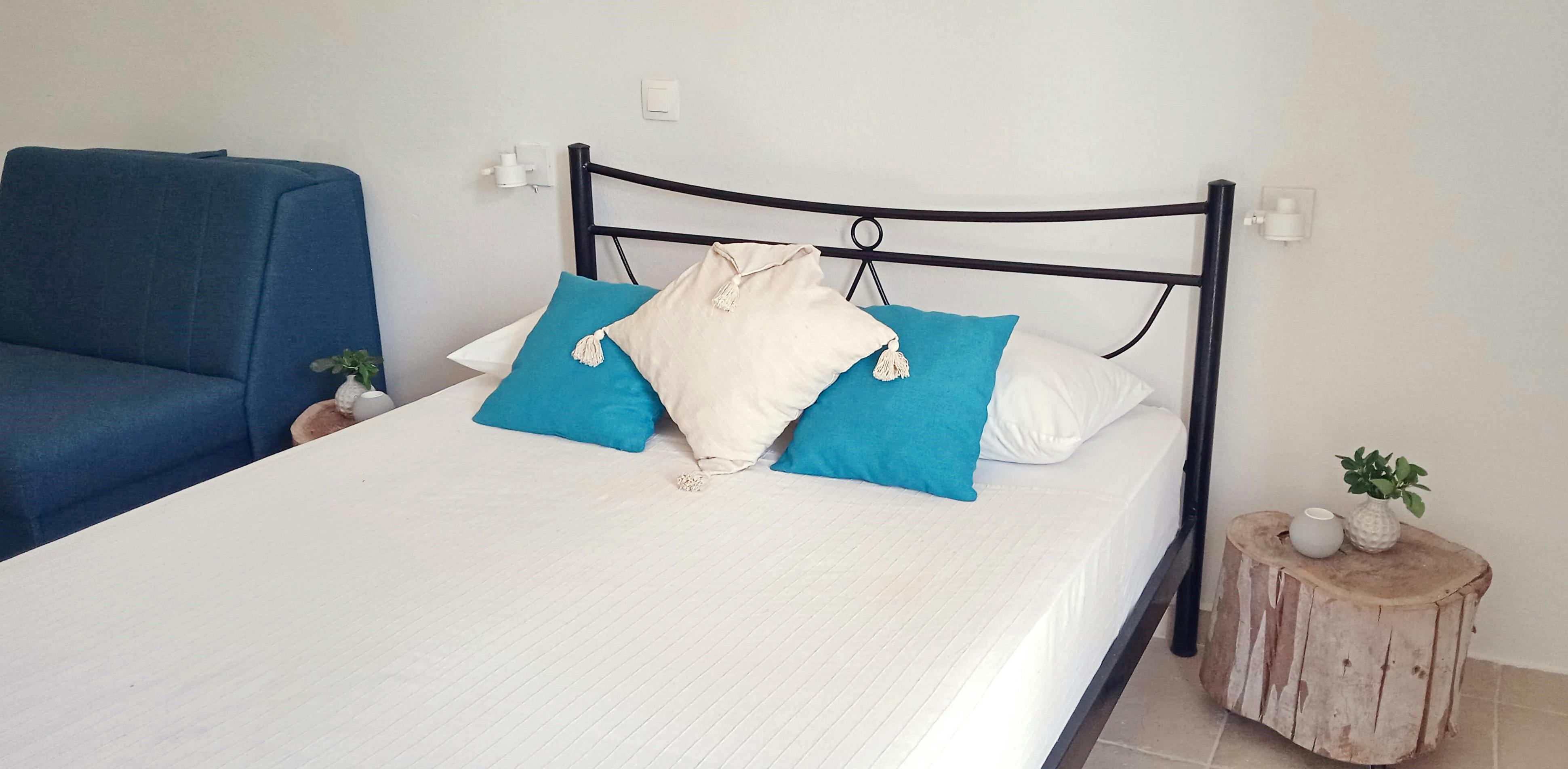 The Seaside Double Room is a bright and spacious retreat designed with couples in mind. Located on the top floor (stairs only), this room features fresh, coastal-inspired decor and a private balcony with a wide, uninterrupted sea view — the perfect place to greet the morning or unwind at sunset.
